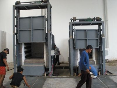 爐門裝置由爐門、爐門提升機(jī)構(gòu)和爐門壓緊裝置組成。爐門殼體由型鋼與板材焊接而成牢固框架結(jié)構(gòu),內(nèi)用耐火纖維壓制模塊疊鋪而成,要求保溫性能好,重量輕等。爐門的提升裝置采用電動(dòng)裝置,主要由爐門架、爐門提升橫梁、減速器、鏈輪、傳動(dòng)軸和軸承等部分組成,爐門升降通過(guò)減速器上正反傳動(dòng)來(lái)帶動(dòng)爐門的升降。爐門提升減速器還配有剎車裝置,可以有效防止?fàn)t門在升降過(guò)程中產(chǎn)生位移。爐門壓緊裝置采用國(guó)內(nèi)先進(jìn)的彈簧式壓緊結(jié)構(gòu),當(dāng)爐子需要提升時(shí),爐門的自重通過(guò)杠桿將爐門自動(dòng)松開(kāi),并水平移出一段距離后上升,當(dāng)爐門下降到位,爐門放下到臺(tái)車上的滑輪上面需壓緊時(shí),由彈簧的彈力再通過(guò)杠桿將爐門水平移進(jìn)到壓緊密封狀態(tài),此種結(jié)構(gòu)的壓緊裝置使?fàn)t門上的纖維平面與爐口棉之間無(wú)摩擦產(chǎn)生,具有安全性能好、使用使命長(zhǎng)的特點(diǎn)。
